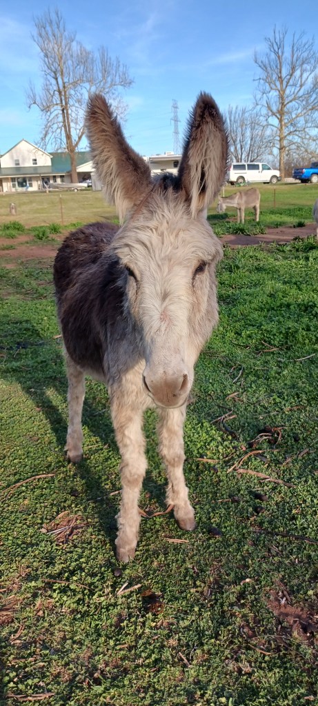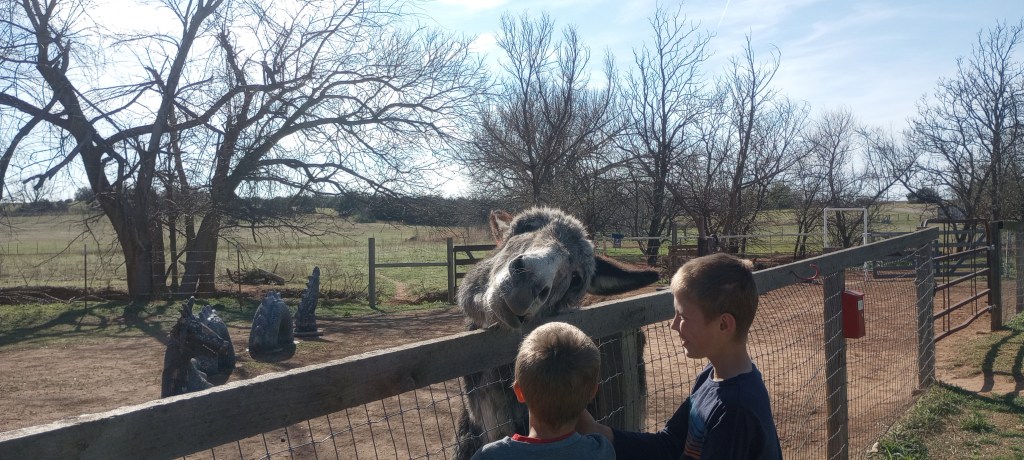 We loved this one night stay at Peaceful Valley Donkey Rescue, northwest of Tulsa, Oklahoma. When we arrived, we received a wonderful lesson about donkeys. Did you know that donkeys do best with a dry diet of hay, and if they eat too much fresh grass they get fat necks that flop over? Also, burros and donkeys are the same animal. Donkeys were the workhorses of the railroad-building of the west, and when the work was over. the donkeys were released. These donkeys were the ancestors of modern-day wild burros.