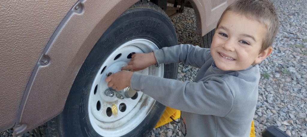 And lest you think it’s all fun and games, Matt discovered flat tire #1 the following morning. Lev makes putting a new one on look fun. Matt got the spare on just in time to be 10 minutes late for church. At the end of the service, the pastor and his wife sent us off to a mechanic friend who patched our tire and sent us off while refusing to accept payment. We’ve actually accumulated quite a list of things that have broken or fallen off and been fixed or replaced, many of them by Mateo Hernick, the fixer. He’s a handy one to have along on this adventure.