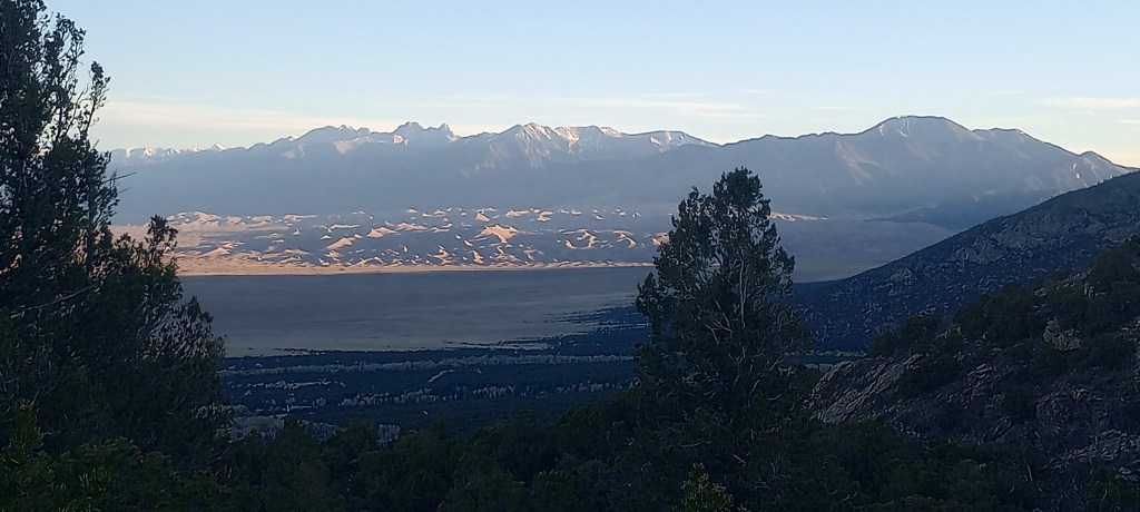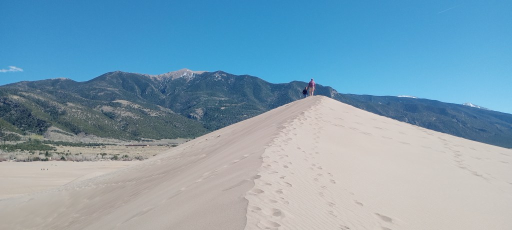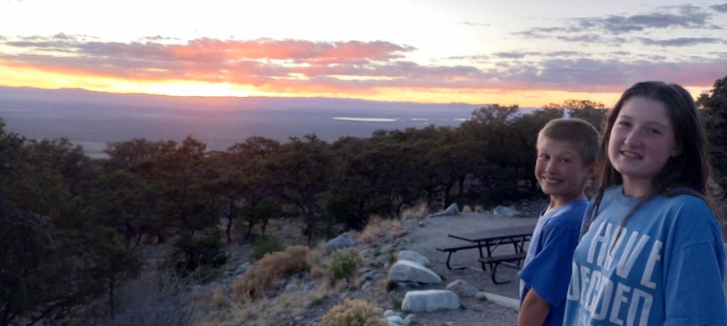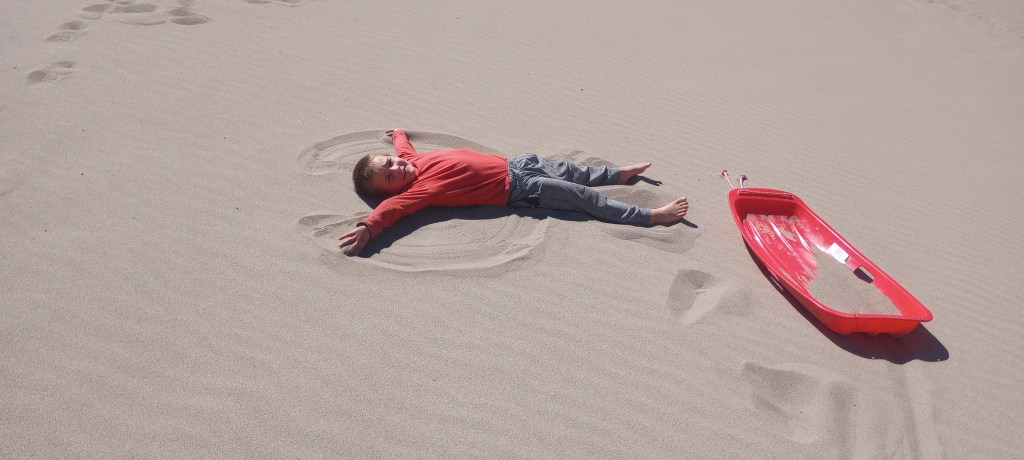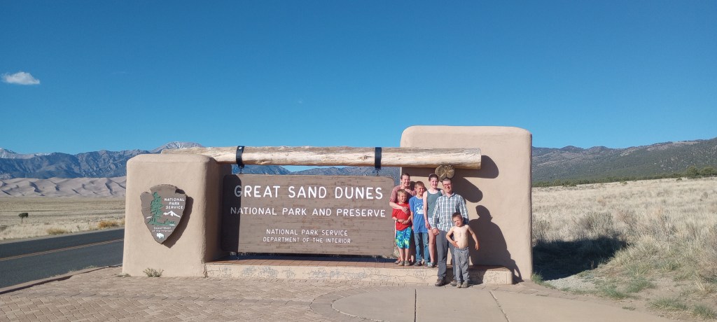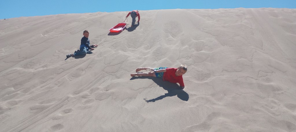 Sliding down dunes, getting covered in sand, visiting a half frozen waterfall, witnessing beautiful sunrises, sunsets and stars. This was definitely a fun stay! This was our first national park on the trip. We had a wonderful campsite at Zapata Falls campground; it was on the side of a mountain. The kids had fun seeing different sites that one of their favorite mystery book characters went to. They also had a blast rolling in the sand, creating structures, and watching the different patterns on the sand. My (Eliza) favorite part was the spectacular views and that there was so much sand, it was like the biggest beach on earth! Us kids were sworn in as Great Sand Dunes National Park and Preserve junior rangers! We earned badges and got to stamp the park’s stamp in our journals. We learned that the sand which forms the dunes came from the surrounding mountains and was blown by the wind into the impressive hills of sand. Some of the dunes are more than 700 feet high!