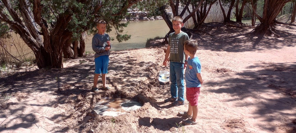 The kids had a wonderful time carving out a dammed pool and a ditch that connected with the river. They enjoyed several rounds of filling up the pool with buckets of water, then breaking the dam and watching the water flow down the ditch and into the river.