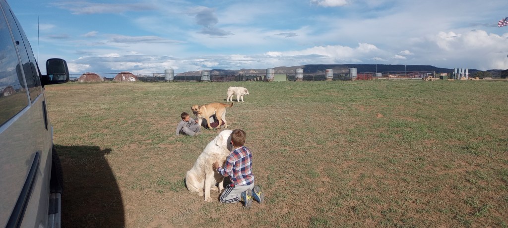 After Great Sand Dunes, we spent a couple nights at a peaceful and well-ordered campground on the Ute Reservation near Pagosa Springs. Then we stayed at a dog ranch near Durango for four nights. There were chickens, goats, and horses, too, but the dogs were the focus because there were a lot of them, Simeon and Lev spent every free moment with them, and the crafty critters swiped two shoes and a bike helmet from us, none of which were recovered in working condition.
