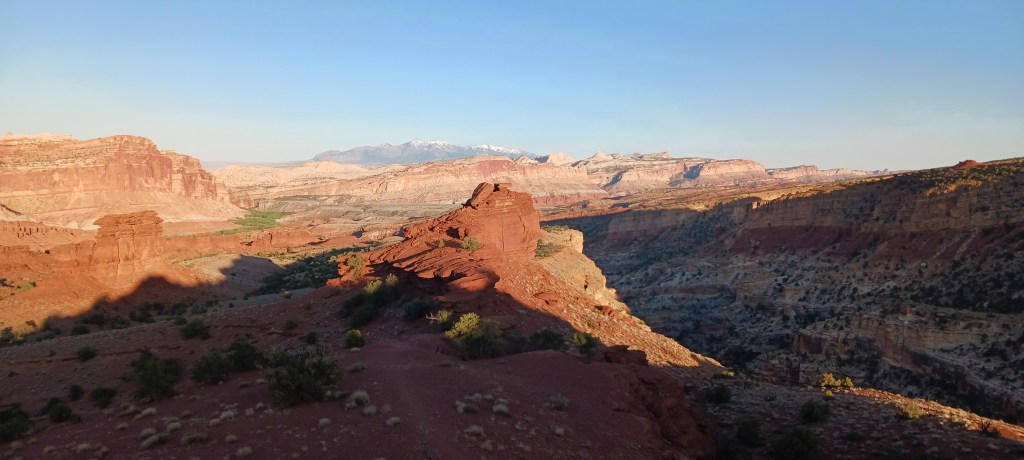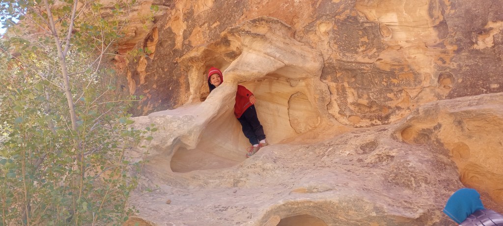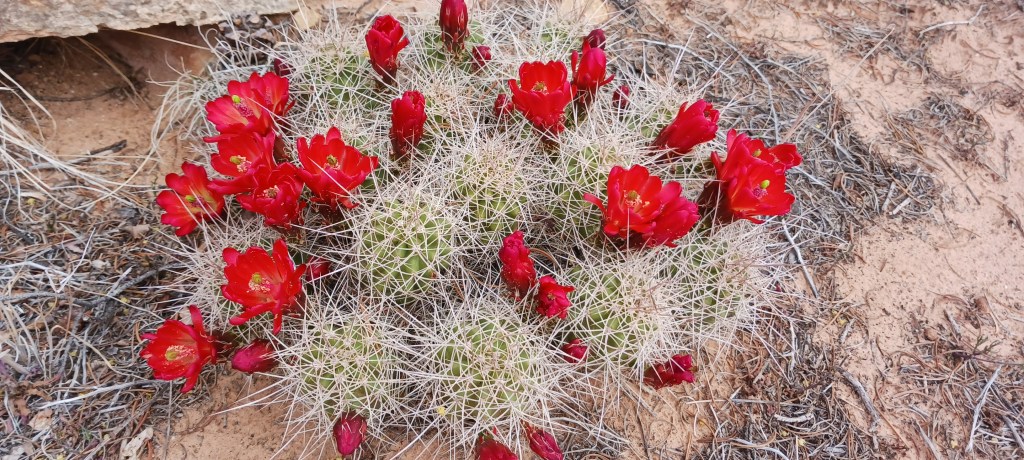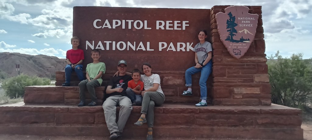 Capitol Reef was a quieter and more simple park. There were some pretty desert flowers here too! The kids and Matt listened to a geology talk by a ranger and learned about a few of the 19 different rock layers displayed at this park. They also learned that black volcanic rocks were transported from nearby mountains by glaciers.