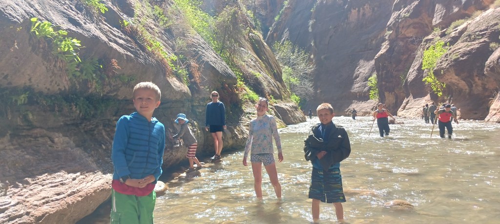 Zion is unlike any other place we’ve seen. The multitudes of cliffs are jagged and colorful. We had a campsite close to the Virgin River and had a lot of fun beach/water time! Another fun thing we got to experience involving water, was The Narrows: a small-ish canyon with a river flowing through it like a path. It was VERY cold and rocky. Some people waded through with dry suits and special shoes. We braved the rapids with shorts, sweatshirts, crocs, keens, chacos, or tevas (and a few piggybacks). Dry suits may have been the more comfortable choice, because by the time we were finished our feet were numb. Thankfully it was a warm day, in the upper 80s.