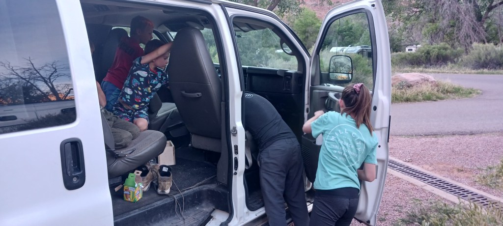 Searching for the squirrel. The kids glimpsed it multiple times inside, and we never saw it leave. We joked that it must have poofed right out of the exhuast pipe while we made our way out of Zion.